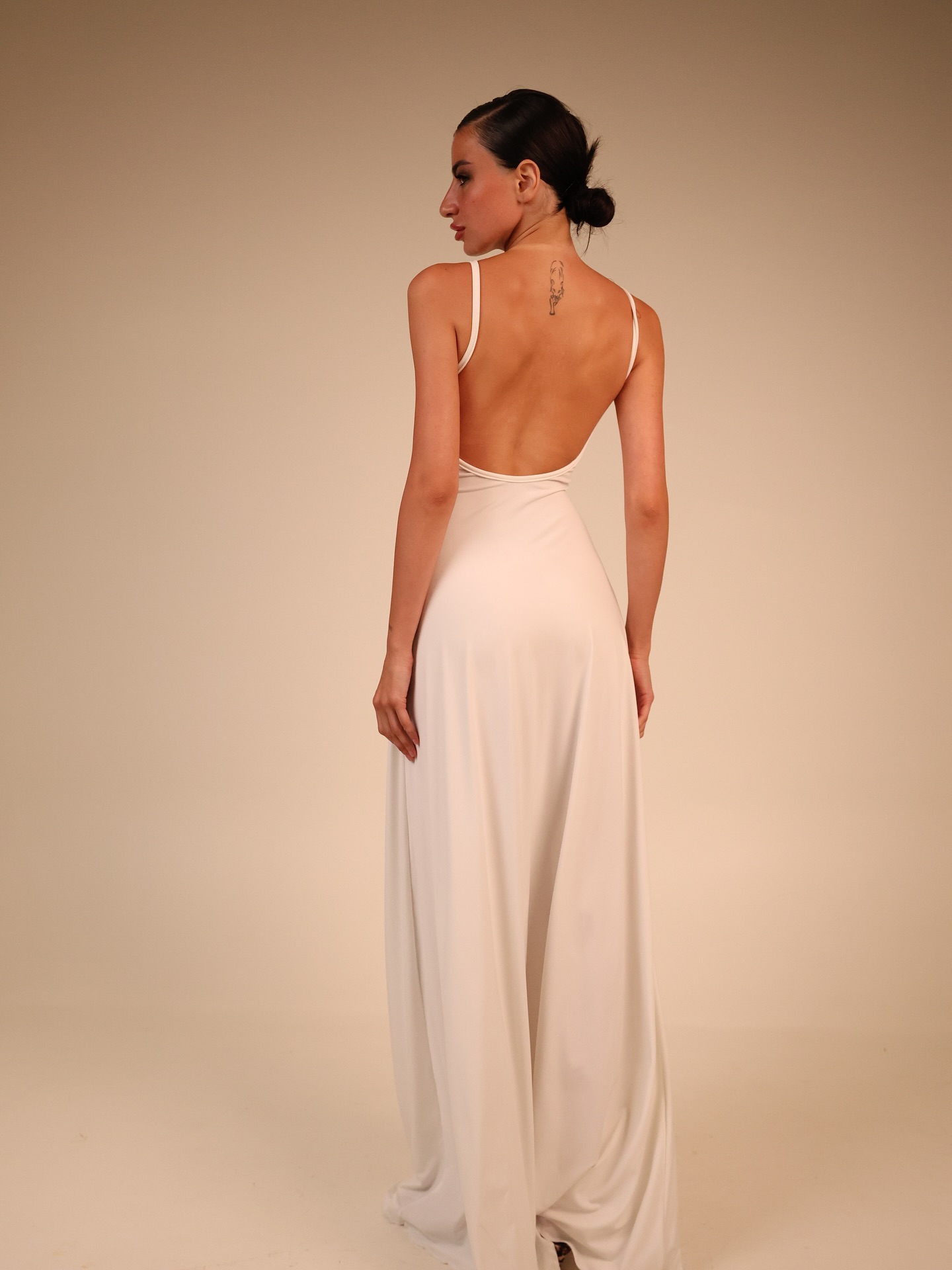 დახვეწილობის სიმბოლო მინიმალისტურ ფორმაში – ეს თეთრი, გრძელი კაბა შექმნილია მათთვის, ვინც აფასებს სისუფთავეს, სინაზეს და ელეგანტურ ხაზებს.