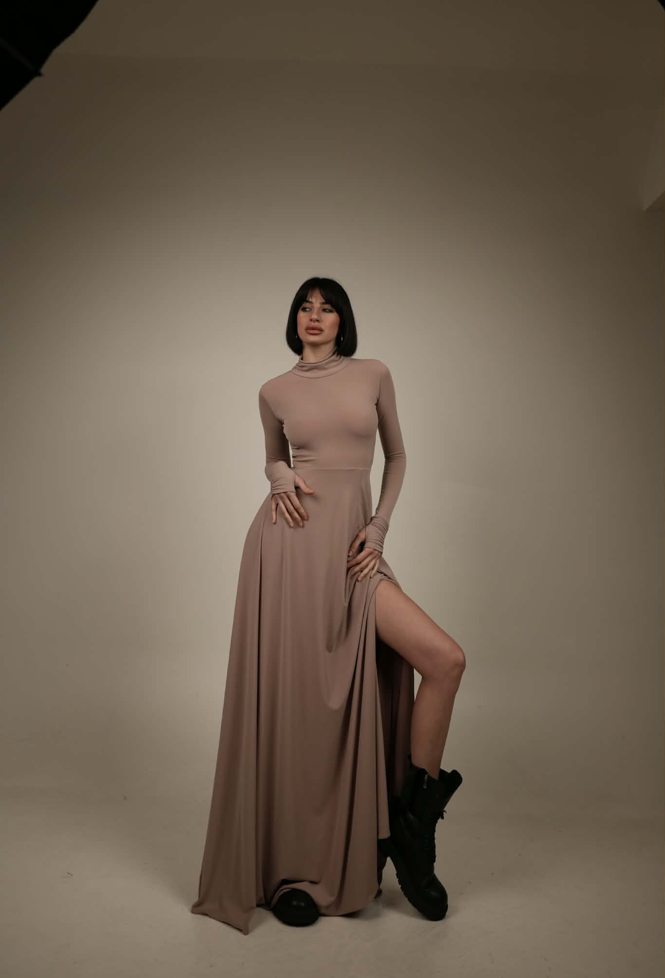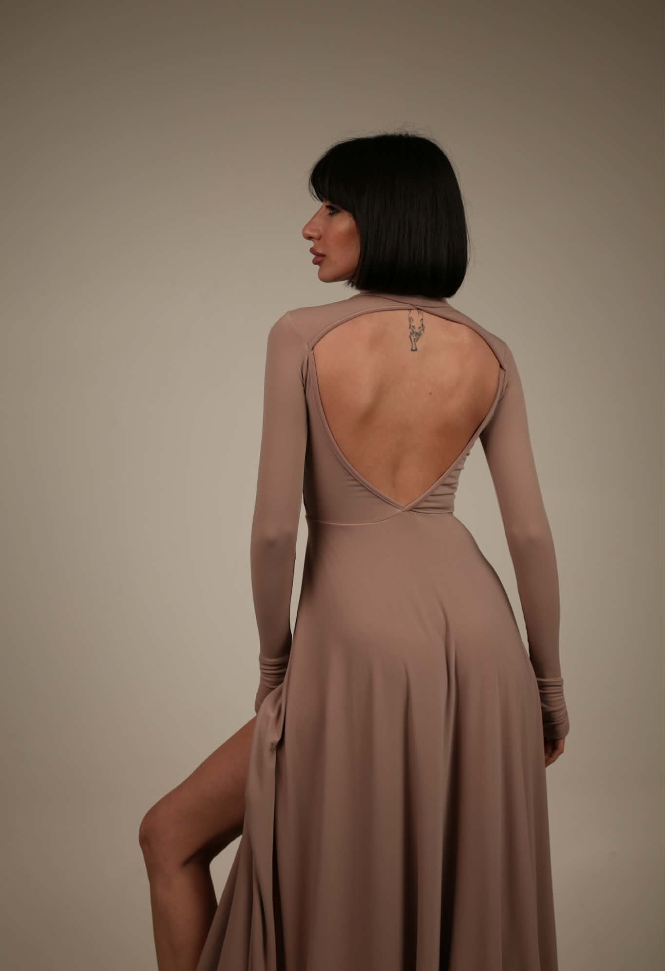 ეს კაბა იქმნება ასკოტის წელვადი ქსოვილისგან, რომელიც იდეალურად ერგება სხეულს და მოძრაობისას ბუნებრივად მიყვება სილუეტს. მსუბუქი ელასტიურობა კომფორტს გპირდება, ხოლო ქსოვილის სირბილე — დახვეწილ იერს მთელი დღის განმავლობაში. ღრმა ღია ზურგი და გრძელი, დინამიური ქვედაბოლო ქმნის დრამატულ ეფექტს, რომელიც არ საჭიროებს ზედმეტ აქსესუარებს — კაბა თავად არის მთავარი აქცენტი. იდეალურია როგორც ქალაქის საღამოსთვის, ისე განსაკუთრებული შემთხვევებისთვის, როცა გინდა ჩუმი, მაგრამ ძლიერი შთაბეჭდილება დატოვო.